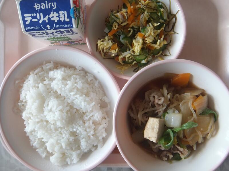 給食・食事本日:12月19日(月)の給食は『みやざき応援給食』でした。牛肉が提供されました。新型コロナウイルス感染症の影響で外食の機会が減っています。そこで、外食で使われる食材を給食で提供し、生産者のみなさまを助ける取組です。メニューは『牛乳・麦ご飯・すき焼き・五食和え』でした。いつもおいしい給食をありがとうございます。(校長:鎌田浩二)
