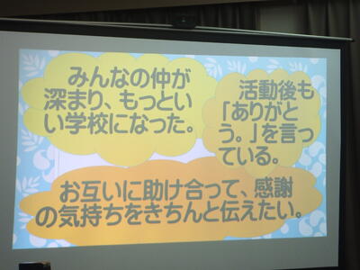 昨日:11月30日(水)、集会を行いました。表彰後、以前、取り組んだ『スクールワイドPBS』(町一貫教育の取組)について、担当の先生から結果の報告がありました。本校では『友だちから声かけや手助けをされたら、ありがとうと言おう』という行動を設定しました。『ありがとう』と伝えた回数は、一人あたり162回でした。これからもたくさん感謝の気持ちを表してほしいと思います。(校長:鎌田浩二)