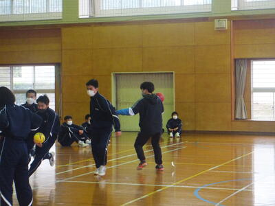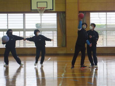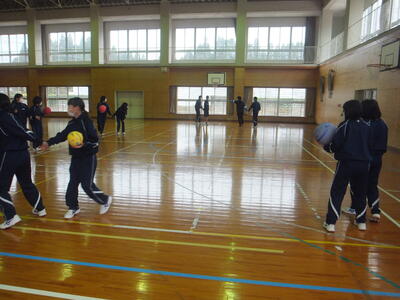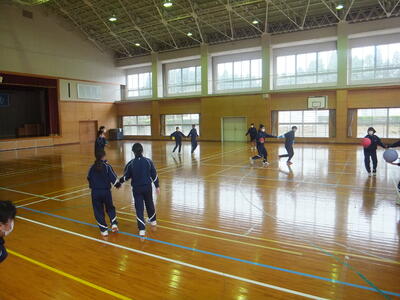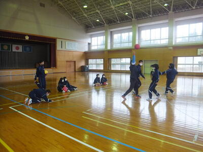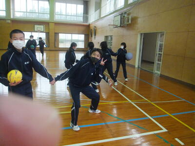本日:12月4日(日)の『持久走大会・門松づくり』は天気が悪いため、12月9日(金)に延期しました。(期日だけの延期です。開催時間等の変更はありません。)平日の開催となり保護者のみなさまにはご迷惑をおかけしますが、できるだけ多くの保護者のみなさまに参加していただけると助かります。ご協力をよろしくお願いいたします。本日の4校時は体育館で保健体育の授業でした。最初の『基礎トレーニング』は、2人組でボールを使ったゲームでした。(保健体育の先生が考えたゲームらしいです。すごい!)寒い日でしたが、みんな楽しそうに笑顔で元気に取り組んでいました。楽しい授業、生徒の活動がある授業・・・いいですね。みていて『ほっ』とします。(校長:鎌田浩二)