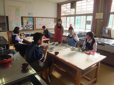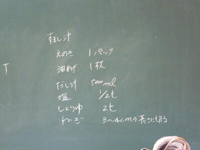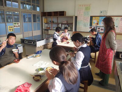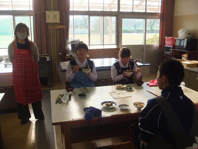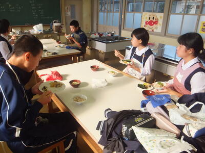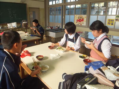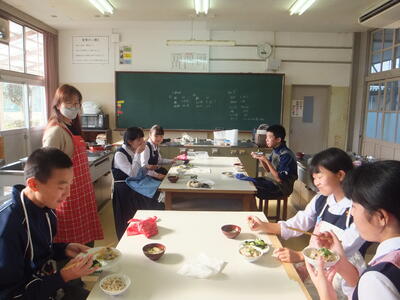 本日:12月7日(水)、『いい香りがするな。給食の準備にしてははやすぎるな。』と思いながら廊下を歩いていると、1年生が『調理実習』をしていました。私が行ったときは、実習後の試食の時間でした。みなさん、おいしく食べていました。その後、時間内に片付けまでしっかりできたそうです。お疲れ様でした。メニューは写真をみながら考えてみてください。(校長:鎌田浩二)