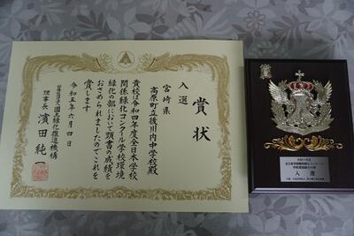 次に、今日の授業の様子です。どの学年も、少人数ではありますが、メリハリのある授業ができています。この調子で学力もグングン伸びていきますよ。最後にお知らせです。令和4年度の全日本学校関係緑化コンクールの賞状と盾が贈られてきました。日頃の生徒達の取り組みが認められたものと思います。これからも花作りに頑張っていきます。