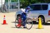 小林警察署の指導員の細かいご指導のもと、自転車通学生全員が、見通しの悪い交差点の通行の仕方を学びました。通行するときのかけ声「右よし!左よし!右よし!後方よし!」が、校庭中に響き渡っていました。