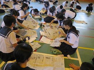 15日(金)に、小中三校合同で取り組んでいる、新聞切り抜き学習を全校生徒で行いました。今回は新聞の中から「挑戦」というテーマの記事を見つけ、その記事に対し、なぜその記事を選んだのか、その記事を読んでの感想などをワークシートに記述していきました。
