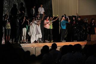 文化発表会が行われました。『花咲け青春 ~輪と和をもって輝け個性~』 本校体育館で文化発表会を行いました。展 示の部では、絵や習字、理科の自由研究や総合的な学習の時間の まとめなど、各教科等の作品が展示されていました英語暗唱や日本語弁論の発表、各学年の総合的な学習の時間の発表、3年生の劇、吹奏楽部の発表、合唱コンクールなどが行われました。