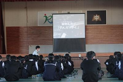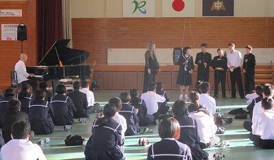 鑑賞教室がありました。「リベラ アンサンブル」と名付けて、ハープ奏者の古賀 鈴子(こが すずこ)さん、サクソフォン奏者の細山田 晃(ほそやまだ あきら)さん、パーカッション奏者の谷口潤実(たにぐち ひろみ)さんに楽器の紹介を含めて、クラシックからMISHIAや嵐のポップス、アニメソングなど様々な曲を演奏していただきました。普段鑑賞することの少ない、本格的な音楽を間近で鑑賞して、その魅力や楽しさを十分に味わうことができたのではないかと思います。