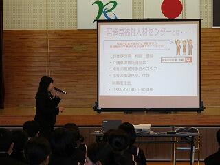 キャリア教育の一環として「福祉の仕事」出前講座を実施しました。当日は、宮崎県社会福祉協議会の方2人と、小林市内の「ふれあいの里」で介護福祉士として活躍されている天神さんに、福祉の仕事について色々な話を伺いました。福祉の仕事の職種や仕事内容、必要な資格、県内の福祉関係の学科がある高校や福祉関係の資格を取得できる大学や専門学校等について、福祉の仕事を選んだきっかけや現在の仕事の内容、そして、仕事で嬉しかったことや苦労したこと等について、話をしていただきました。