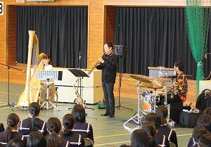 鑑賞教室がありました。「リベラ アンサンブル」と名付けて、ハープ奏者の古賀 鈴子(こが すずこ)さん、サクソフォン奏者の細山田 晃(ほそやまだ あきら)さん、パーカッション奏者の谷口潤実(たにぐち ひろみ)さんに楽器の紹介を含めて、クラシックからMISHIAや嵐のポップス、アニメソングなど様々な曲を演奏していただきました。普段鑑賞することの少ない、本格的な音楽を間近で鑑賞して、その魅力や楽しさを十分に味わうことができたのではないかと思います。
