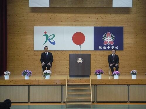 平成31年3月28日(木)に離任式が行われました。本校から假屋啓一郎教諭(9年勤務)、黒木宗太講師(2年勤務)、右田ひとみ事務主事(3年勤務)の3名の先生方が転出されました。紙屋中学校のために、熱心にお仕事をしていただきました。また、子どもたちのために頑張っていただきました。本当にありがとうございました。お疲れ様でした。