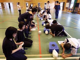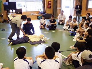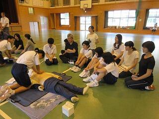 平成30年6月24日(日)に第2回学校参観日がありました。同時に学校保健委員会の一環で、標記の教室が開催されました。当日は、小林消防署野尻分遣所の消防士の方々に来校していただき、心肺蘇生法の講習が行われました。保護者、生徒、先生方が参加して、救急救命士から説明がありました。各グループに分かれて、消防士の方々から指導を受けながら、講習をしました。参加者は真剣に取り組み、有意義な時間となりました。