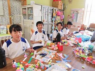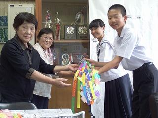 平成30年7月4日(水)に、紙屋地区の更生保護女性会の代表方々が2名来校されて、七夕の短冊や飾りもの、笹竹を持参していただきました。話を伺いましたら、1年がかりで準備されているとのことでした。子どもたちの喜ぶ姿が見たいので、何年も続けておられるとのことでした。ほんとうにありがとうございました。生徒の皆さんの願い事が叶うことを祈念しております。