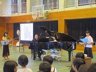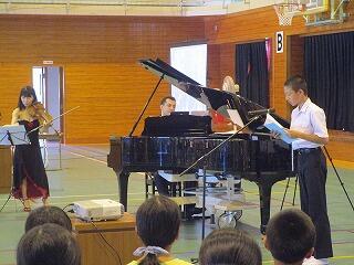 平成30年7月4日(水)午前中に、野尻中学校体育館で、標記の鑑賞教室が実施されました。野尻町出身で海外で活躍されている加野景子様をニューヨークからお招きして、バイオリンとピアノ演奏が行われました。その中でマンハッタンストーリーのお話を、町内の中学生数名が英語で発表しました。紙屋中からは、藤田さん、小田君が代表で英語を読みました。皆さん、演奏に酔いしれたことでしょう。いい思い出ができました。大角様をはじめ企画、運営を担当された方々、野尻中学校の生徒さん、先生方、設営等にたいへん感謝いたします。ありがとうございました。