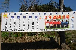 平成30年11月11日(日)に宮崎県中学校駅伝大会が公認西都マラソンコース(西都市)で開催されます。女子の部に出場します。それに向けて、保護者会で素晴らしい横断幕(看板)が紙屋小学校・中学校の出入り口の国道268号線沿いに設置されています。最後まであきらめない悔いの残らない走りに期待したいと思います。頑張ってください。