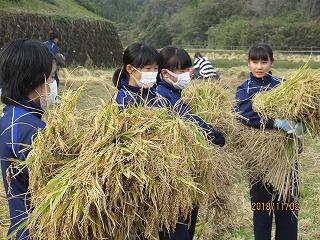 平成30年11月2日(金)に紙屋小学校・中学校合同稲刈りが近所の学校田ですばらしい天候に恵まれて無事に終了しました。感謝の気持ちで餅米の収穫をさせていただきました。これまで陰で草刈りや水の管理などいろいろサポートしていただいた保護者や地域の皆さん、本当にありがとうございました。