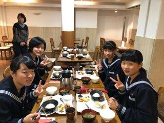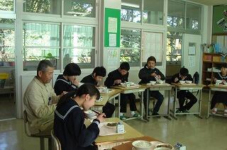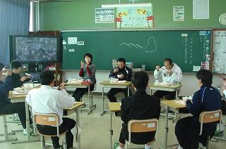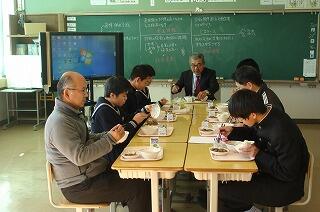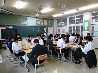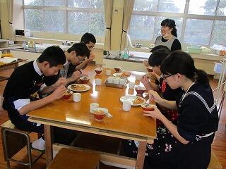 平成31年2月19日(火)に3年生の家庭科の授業(6名)で調理実習がありました。おいしいそうなピザやスープ、デザートが出来上がったようです。学級担任の曽山先生も一緒に参加していました。3年生のみなさんはおいしそうに食べていますね。職員にもデザートの試食がりました。校長先生も食べられて、「たいへん良い味でした!」と言われていました。指導していただいた小園先生、お疲れ様でした。
