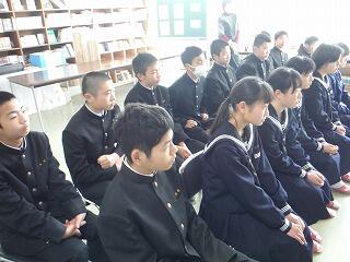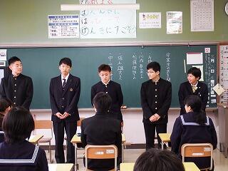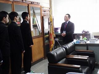 平成31年2月20日(水)に、校長室にて、松原校長先生から、進学が内定した3年生に向けて、卒業までの学校で過ごし方や生活面、学習面などについて大事な事柄について話をしていただきました。その中で、これから高校入学までの日々がいかに大切かについてありました。現在中学校で勉強していることが、4月に高校に入学後役に立つことなどを話されたようです。1日1日を大切に、感謝の気持ちを忘れずに頑張ってほしいものです。
