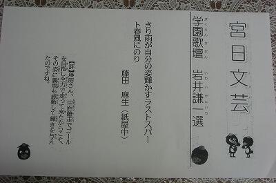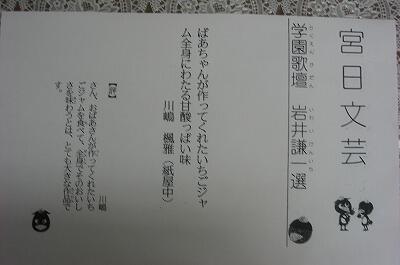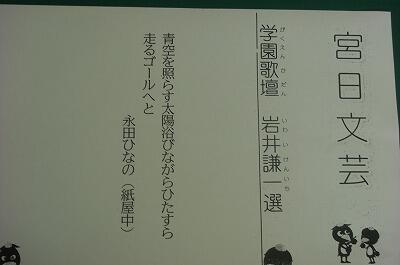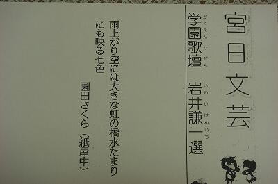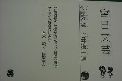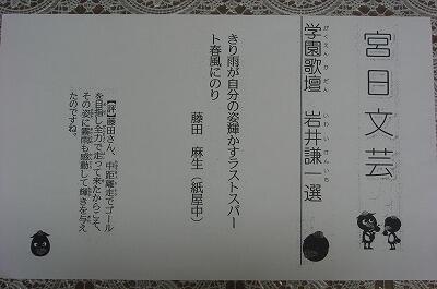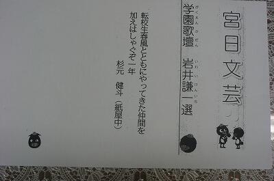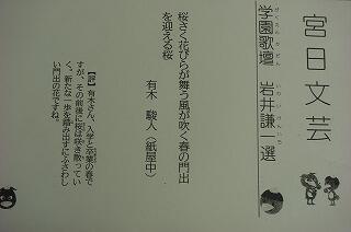 令和元年5月25日(土)付けで、生徒作品が「宮日文芸」の学園歌壇 岩井謙一選に掲載されました。すばらしい出来映えのようです。次も期待しています。宮崎日日新聞社提供