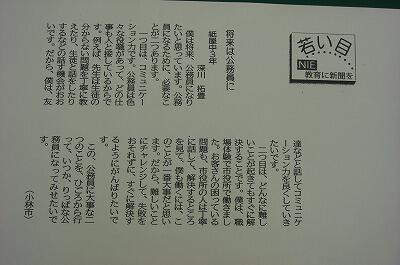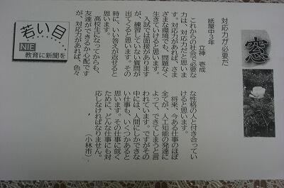 令和元年5月19日(日)付け「若い目」欄に掲載されました。「私の将来の夢」という題で素晴らしい作文となっています。また頑張ってください。期待しています。宮崎日日新聞社提供