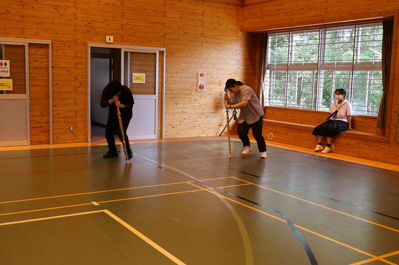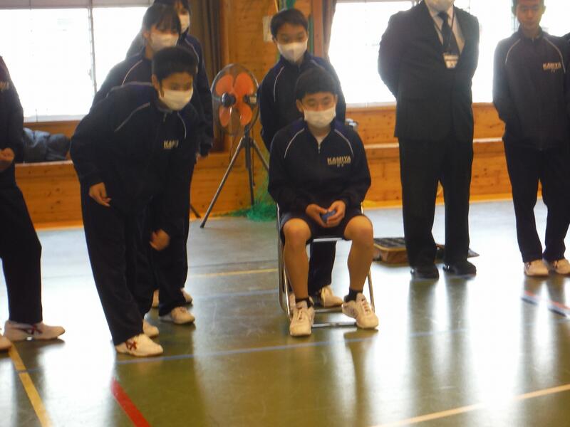 ます、団の色を決定するために、団長と副団長、団顧問によるぐるぐるバットリレーを体育館で行いました。