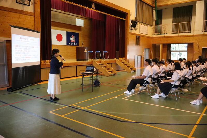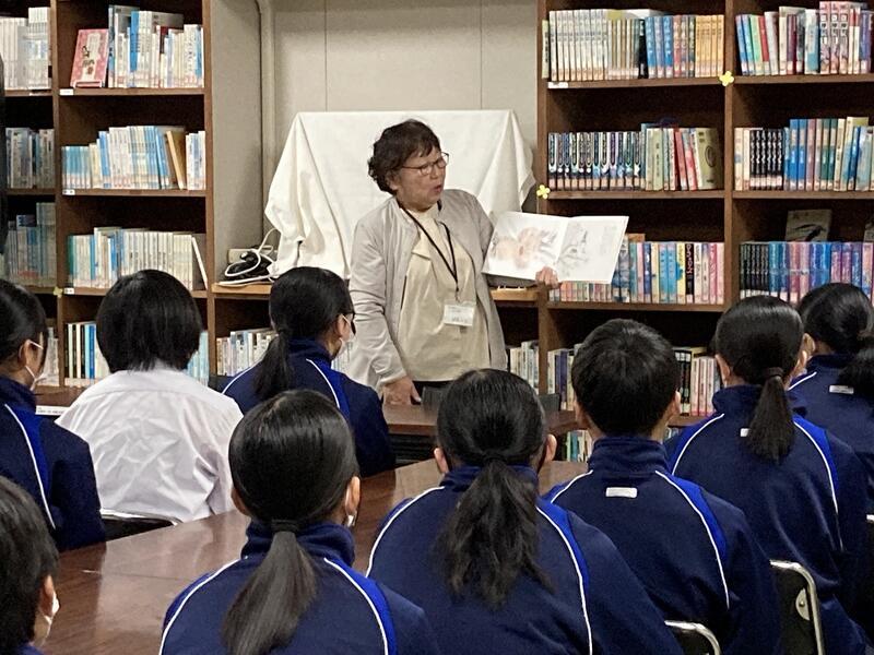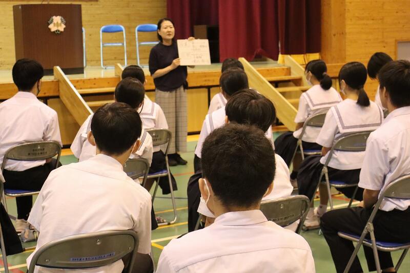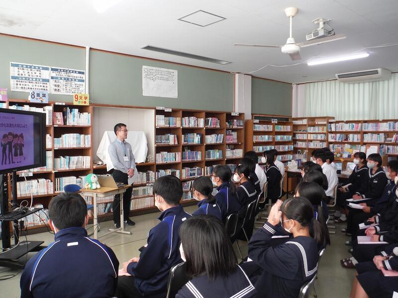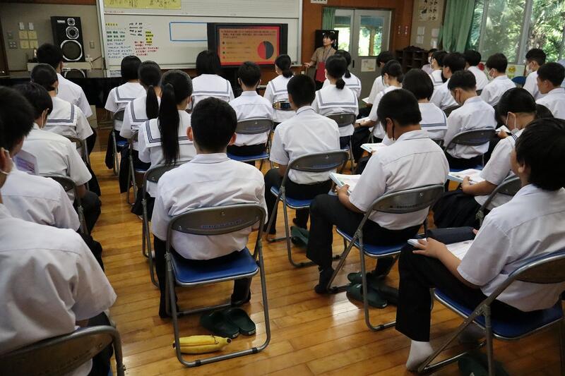 9月24日(水)、全校生徒を対象とした平和学習を実施しました。内容は、講師の常盤 泰代 様による平和に関する講話です。戦中戦後の様子が分かる資料等をもとに、生徒にも伝わる言葉で分かりやすく話をしていただきました。生徒たちには、今日学んだことを通して、世界の平和にも目を向け、未来のために何ができるかを考えて欲しいです。