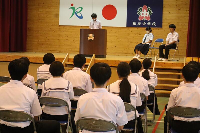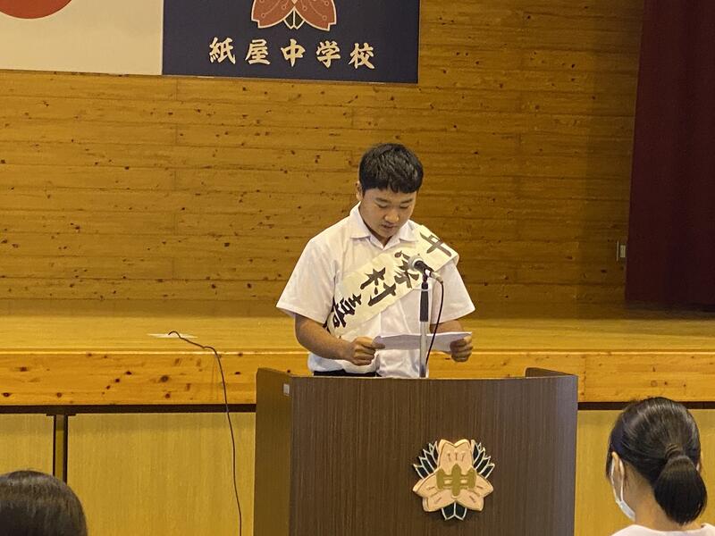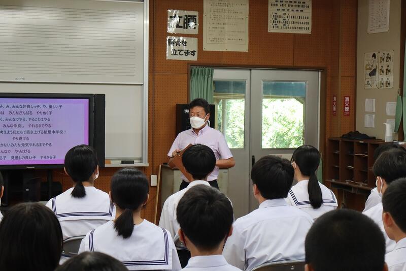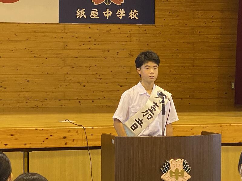 37日間の夏休みが終わり、本日より1学期後半がスタートしました。 本日実施した全校集会では、年度当初に生徒たちにお願いした紙屋中学校の校訓である「克己」「敬愛」「創造」につながる3つのことについて改めて話をしました。1学期後半も「はっきりとした目標をもち、努力すること」「『感謝・思いやりの心』を持つこと」「未来を切り拓くための力をつけるために、授業を大切にすること」を意識し、自分に負けず頑張ってくれることを期待しています。保護者や地域の皆さま、1学期後半もどうぞよろしくお願いいたします。