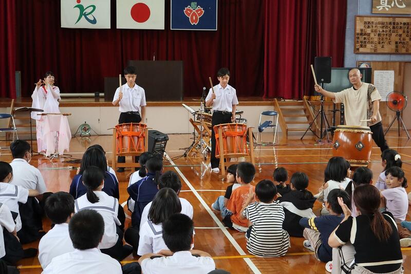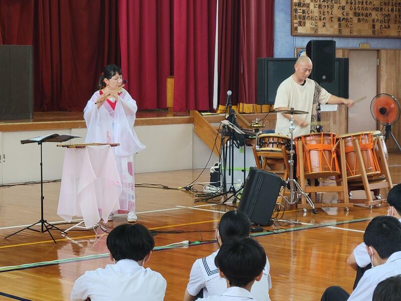 市キャリア教育支援センターのご紹介で、和楽器ユニット「かんがみぞ」の和太鼓奏者、小林 太郎さんと、笛奏者の物部 聖子さんによる、迫力のある演奏を目の前で聴かせていただきました。