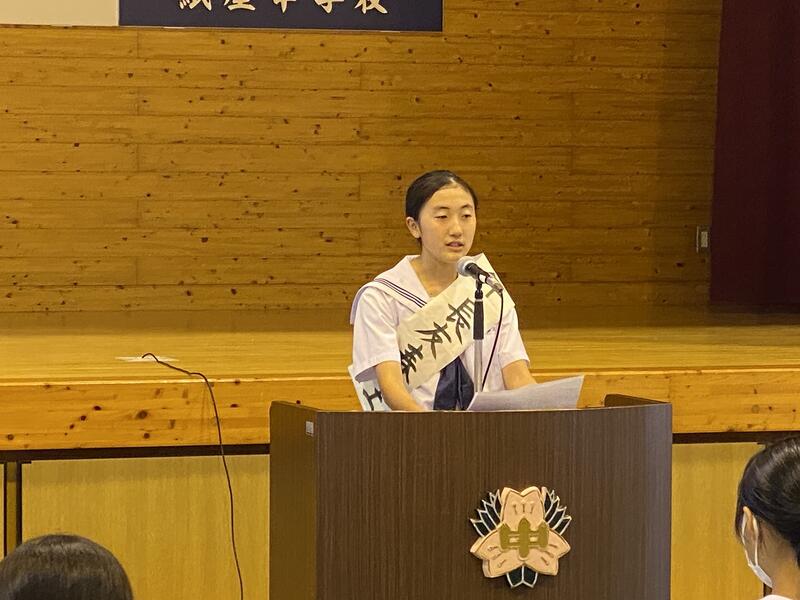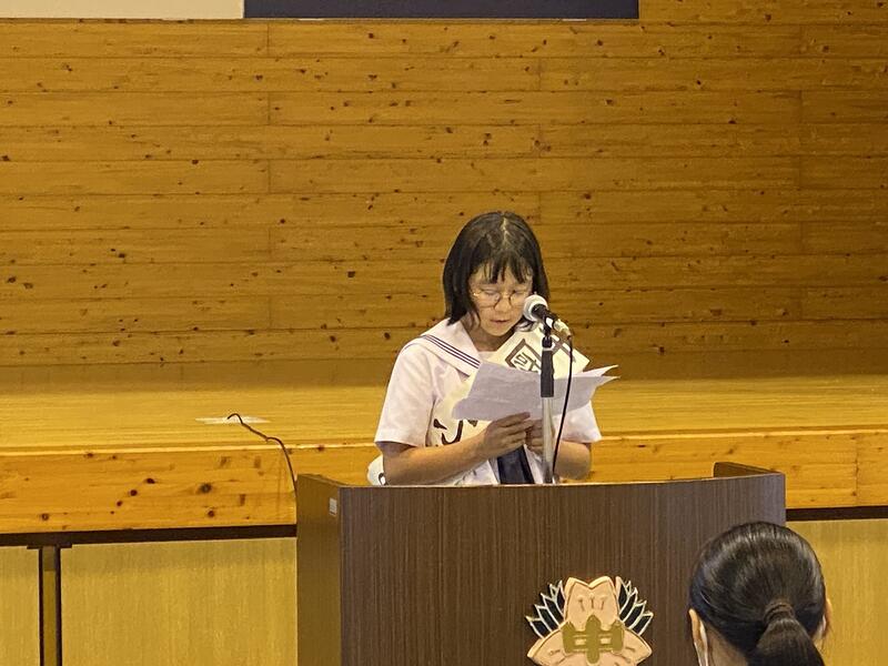 本校からは、バドミントン部、陸上クラブ、女子バレーボールクラブが出場します。それぞれのキャプテンから抱負が述べられた後、選手を代表して、女子バレーボールクラブキャプテンの濱嶋 凜さんが選手宣誓を行いました。