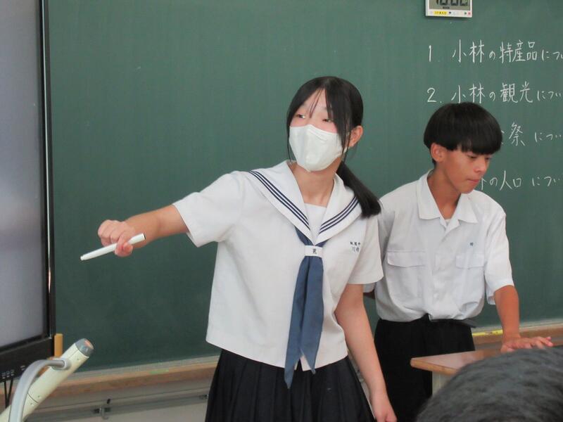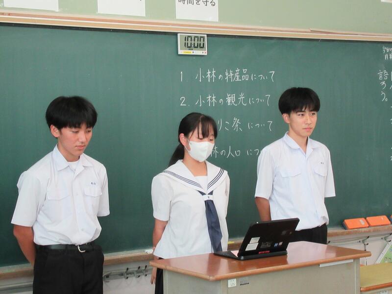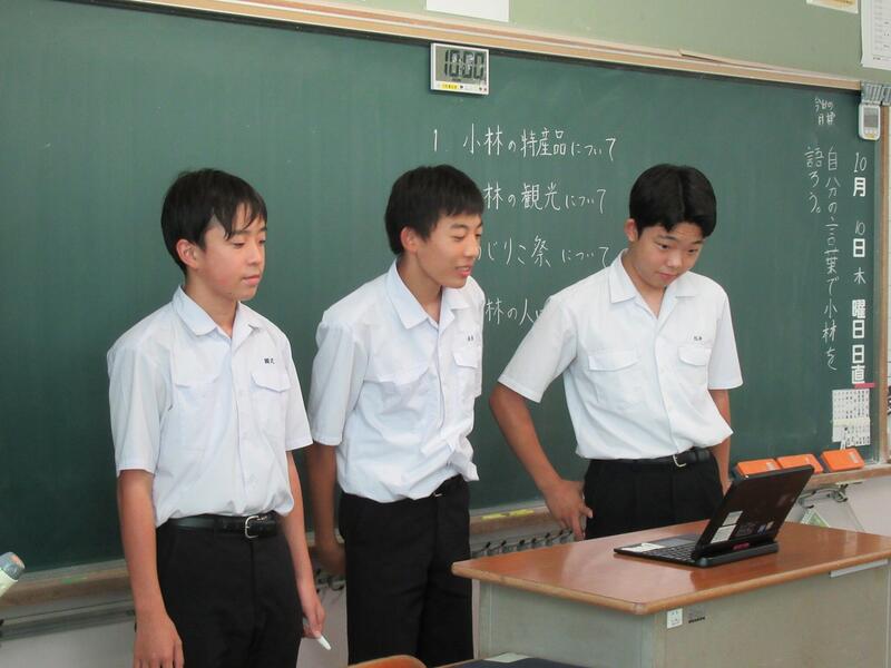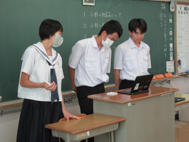 10月10日(木)の5、6校時、3年生のこすもす科で作成している「小林市未来予想図」の経過発表会を、小林市長宮原 義久様と、市役所の方々に見ていただきました。