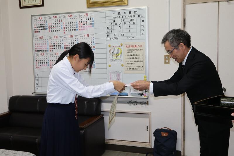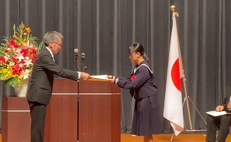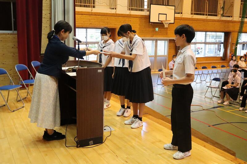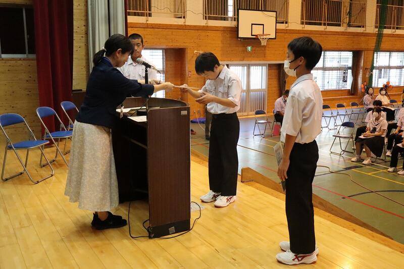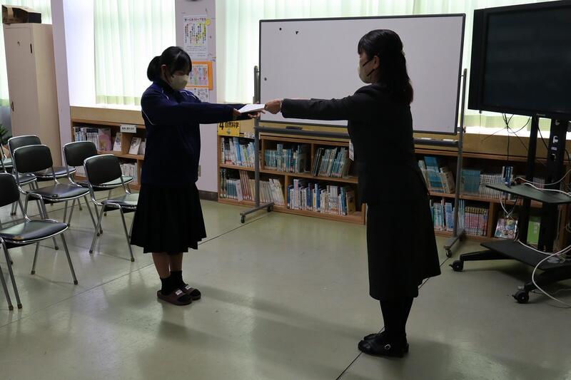 続いて、残念ながら1名の欠席がありましたが、代表として1、2年生の学級委員長に修了証書を渡すことができました。