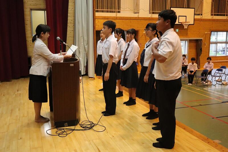 専門委員会ごとの目標や反省の発表の後、SDGsクイズ、いじめ防止宣言、あいさつ練習、身だしなみチェックと、担当の生徒たちがスムーズに進めていく様子に、大いに成長を感じました。