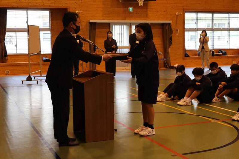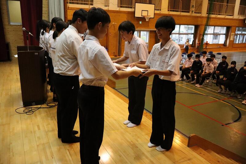 はじめに、秋季体育大会や作品の表彰が行われました。たくさんの生徒が入賞し、表彰も思った以上に時間がかかり嬉しい悲鳴でした。