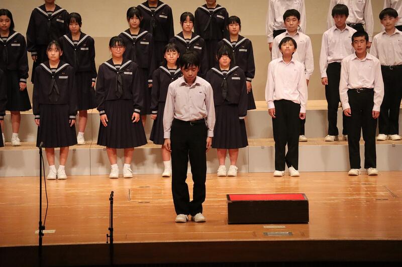 式では、はじめに1年生代表の鍛冶 來心さん、2年生代表の松井 優誠さんが年間の反省を述べました。テスト勉強についての反省や、クラブ活動、係の仕事を頑張ったことなどを舞台上でしっかりと読み上げることができました。