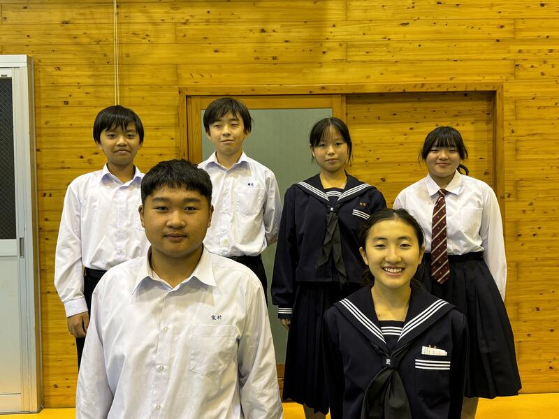 SDGs推進リーダーの宗方 嘉音さん、魅力発信推進リーダーの家村 嘉翔さん、いじめ防止推進リーダーの石川 ひかりさん、校則改定推進リーダーの川久保 波那さん、学習文化委員長の坂上 さらさん、生活保体委員長の濱嶋 凜さん、図書委員長の長友 春佳さん、7名の生徒会執行部の今後の活躍を期待します。