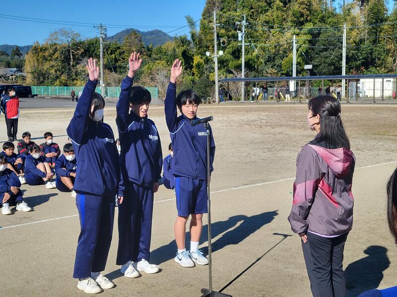 同時に、地区駅伝大会と県秋季体育大会の激励会を行いました。本校か決まっています。代表で、3年生の栓山 梓真さんの選手宣誓があり、今年度最後の大きな大会への抱負が述べられました。
