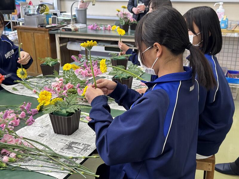 4月24日(木)の放課後、各学年及び職員玄関横、校門坂花壇の花の苗植えを行いました。事前に学校用務員の源島さんに花壇を耕したり肥料を入れたりして準備していただき、昼休みには、係の生徒たちが植える場所を決めるなどの準備をしてくれました。放課後は、初夏のような暑さの中でしたが、花の苗を全校生徒で一つ一つ丁寧に植えてくれました。これからの季節に向けた色とりどりの花々で満開の花壇が目に浮かぶようです。