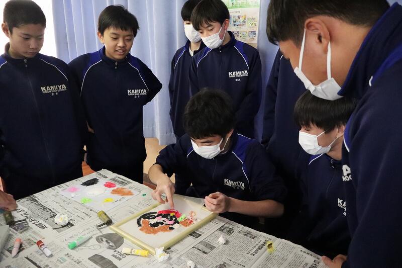 1年生の生徒たちは熱心に作業に取り組み、思い思いの絵を陶器に描いていました。