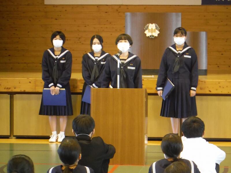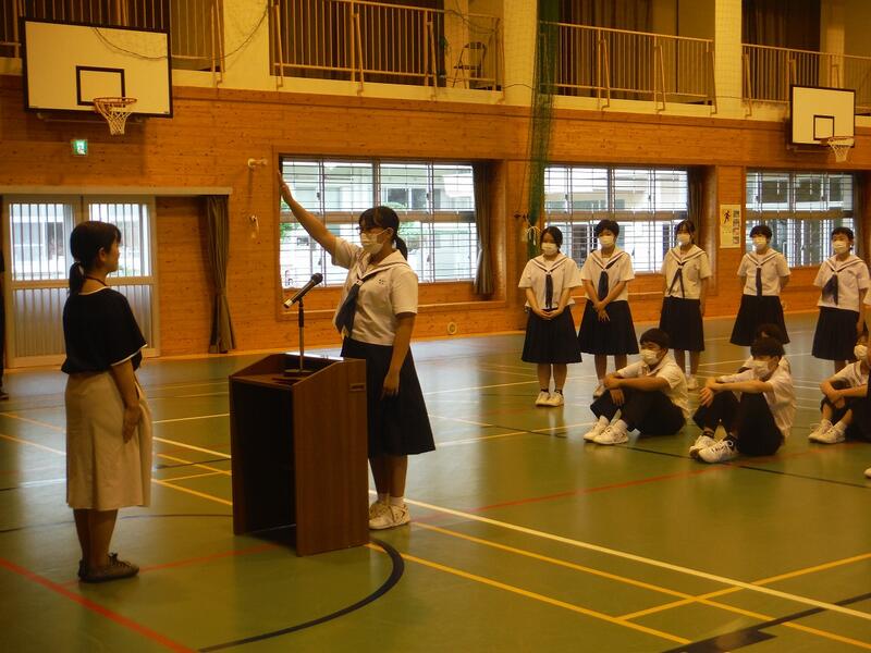バドミントン部、陸上クラブ、女子バレーボールクラブの各チームのキャプテンが抱負を述べ、選手を代表して、3年生の藤田 友羽さんが選手宣誓を行いました。