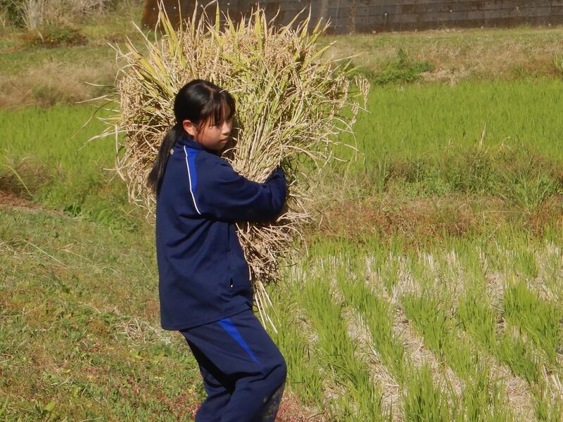 生徒たちは慣れない鎌の扱いと、予想以上の刈り取り量の多さに苦戦していましたが、次第にコツをつかんで見事に全て刈り取り、翌日脱穀していただきました。