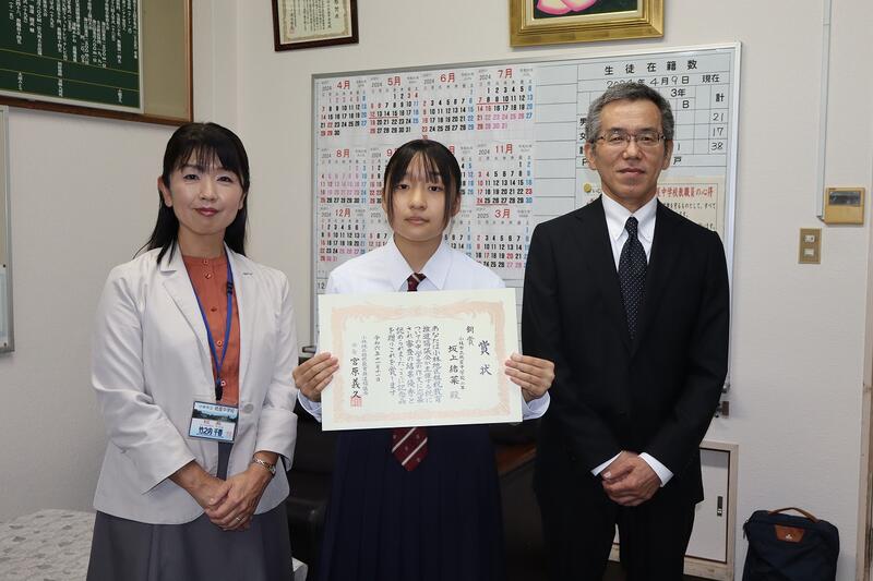2年生の坂上 結菜さんの作品が銅賞に選ばれ、税務署長の梅林様より賞状と副賞をいただきました。