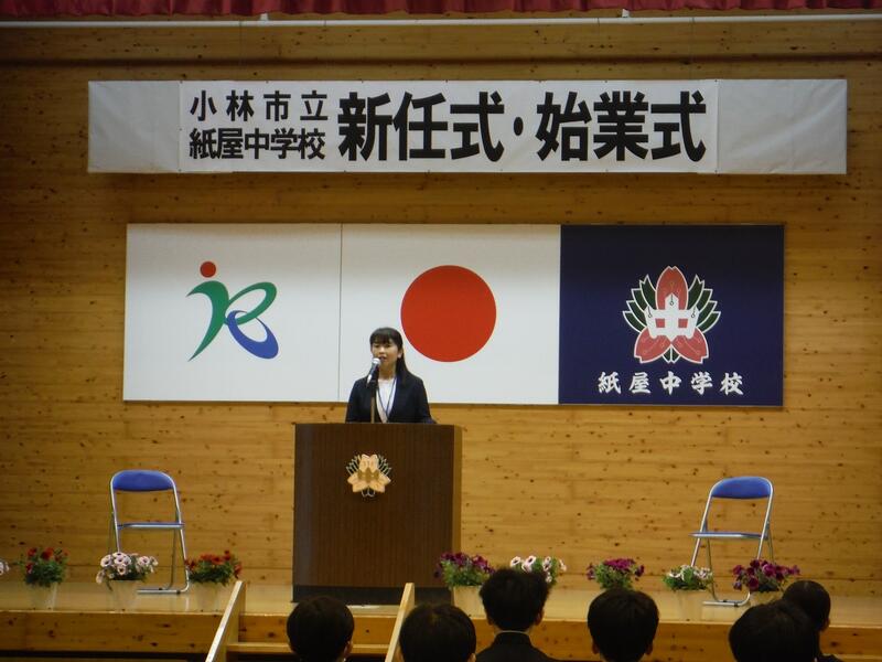 新任式では、国語科の江藤 佳孝先生と、英語科の早瀬 美佑先生が生徒に向けて元気にあいさつをしてくださいました。生徒を代表して、3年生の白尾 弥和さんが歓迎の言葉を述べました。