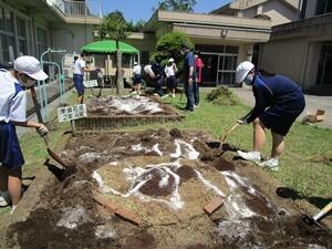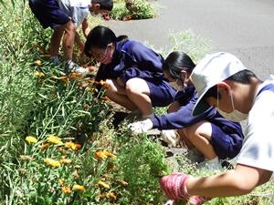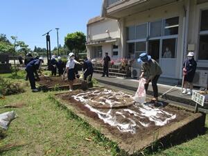 昼休みなどの時間を使って子供たちと職員、総出で花だんの手入れをしました。