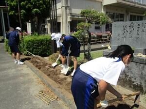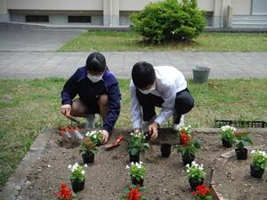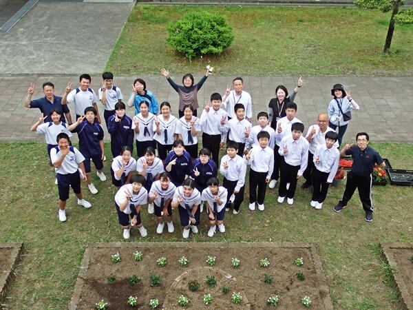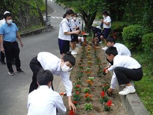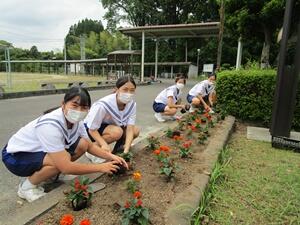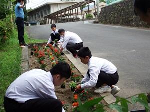 先週の金曜日(5月15日)、全校生徒と職員全員で学校の花だんにサルビアとトレニアの花を移植しました。まだ株は小さいのですが、これから夏に向けてきれいな花をつけてくれると思います。