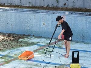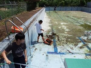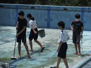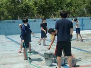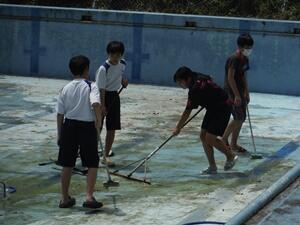 子供たちが今、一生懸命頑張っています。少ない人数ではありますが、一人一人の作業量がとても多くて広いプールもみるみるうちにきれいになりました。