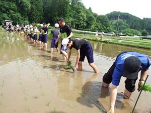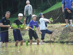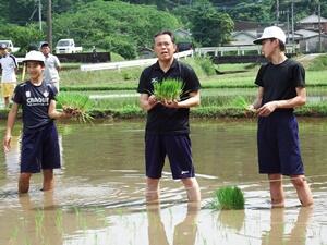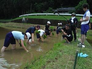 先週6月5日の金曜日に、毎年恒例になっています小中合同の『田植え』を中学校全校生徒25名と紙屋小学校5年生12名で行いました。今年はUMKテレビ宮崎の「のびよ!みやざきっ子」という番組の収録もかねて、テレビ局から来られた方々も一緒に大人数の田植えでした。