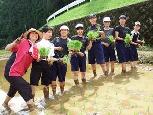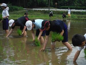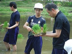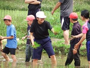 田口先生はもちろんのこと、校長先生や矢野先生も田んぼに入って子供たちと一緒に田植えを”楽しみ”ました。