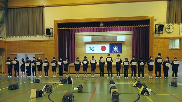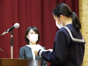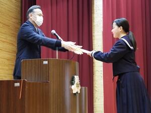 あわせて、1年間欠席のなかった生徒(皆勤賞)の表彰も行われました。1年生3名、2年生7名の計10名が表彰を受けました。