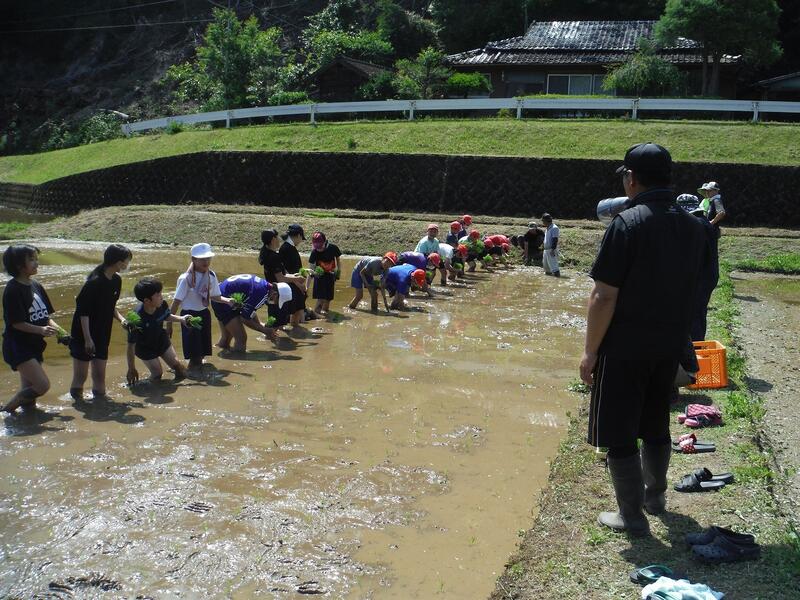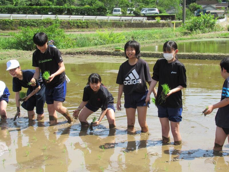 本校の地域コーディネーターである杉元 秀三様に学校田の整備等をしていただき、JAの方々には植える稲を提供いただき、またPTA生活指導部の方々に前日草刈りのご協力をいただいて、実施することができました。