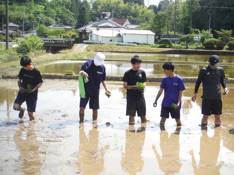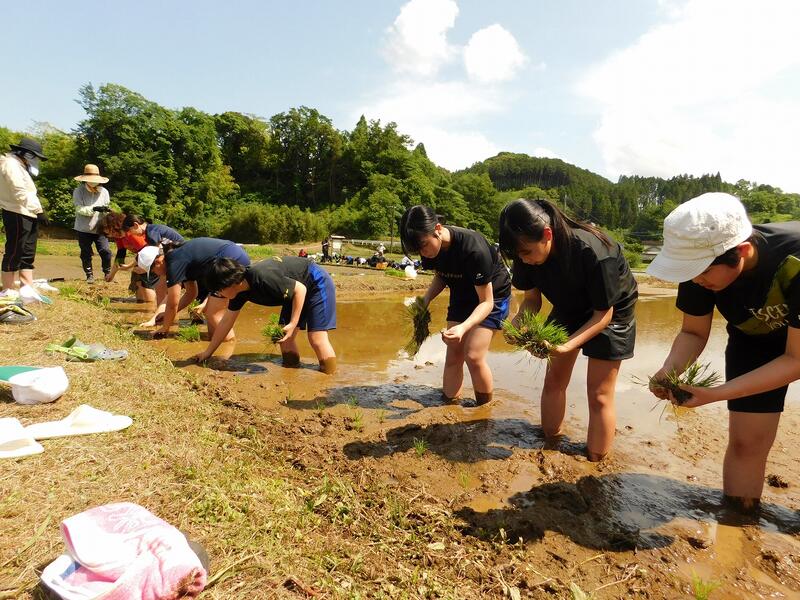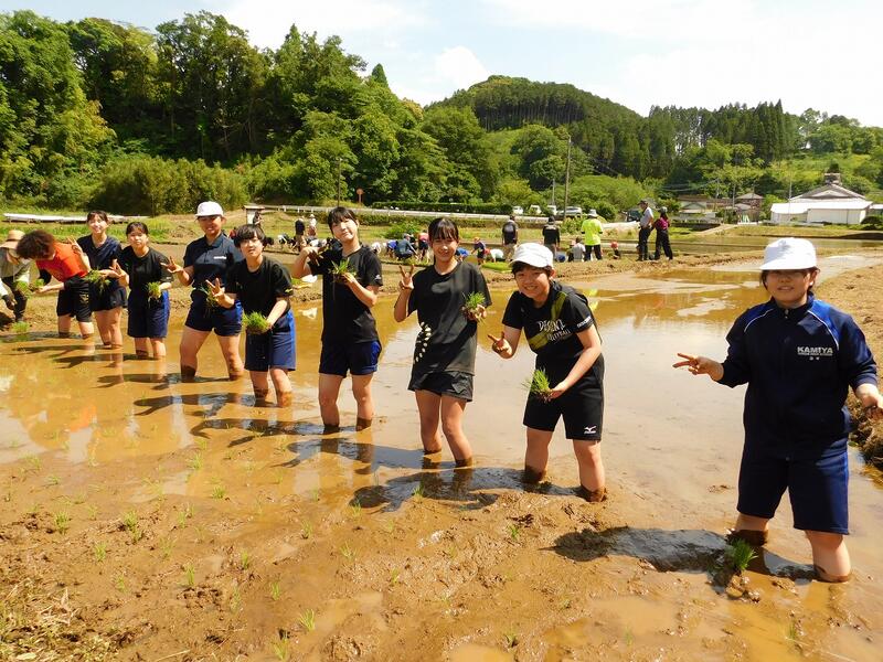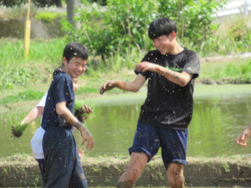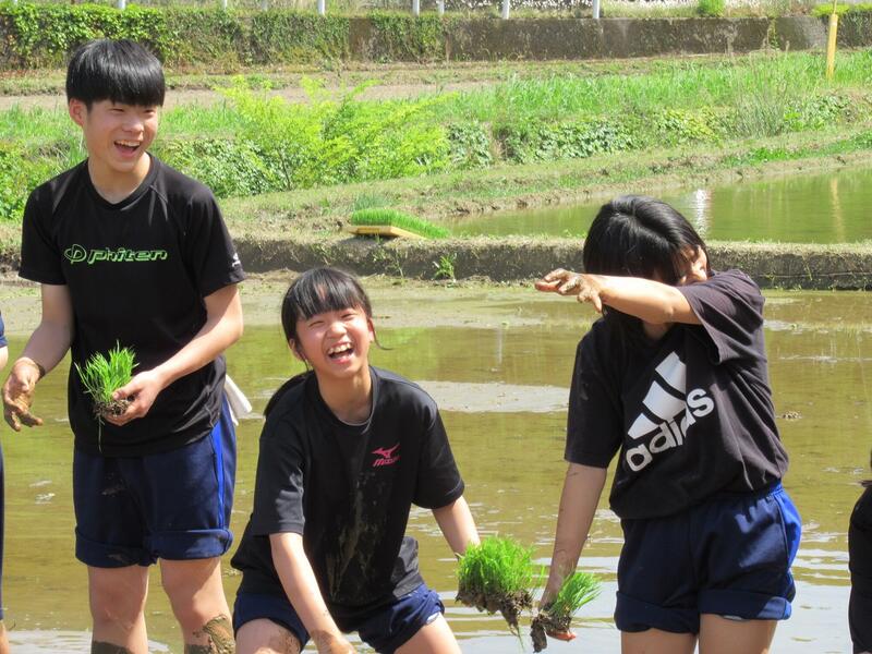この日は大変天気が良く、日焼けや泥汚れを気にしながらの田植えかと思いきや、初めこそ恐る恐る田んぼに足を踏み入れよろけていた生徒たちも、あっという間に慣れ、最後には泥の掛け合いで大騒ぎしていました。また、ALTのミリアム先生も初めての田植えとのことで、興味をもって参加してくださいました。