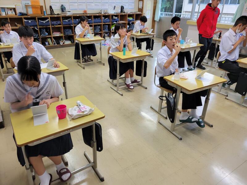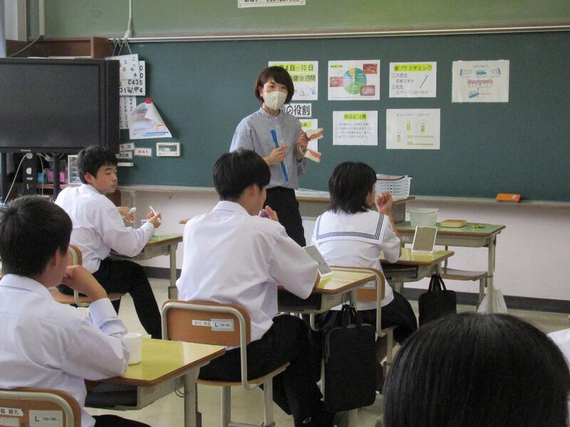 本校では、養護教諭の河野先生が、給食後に歯磨き指導を全学年で行いました。