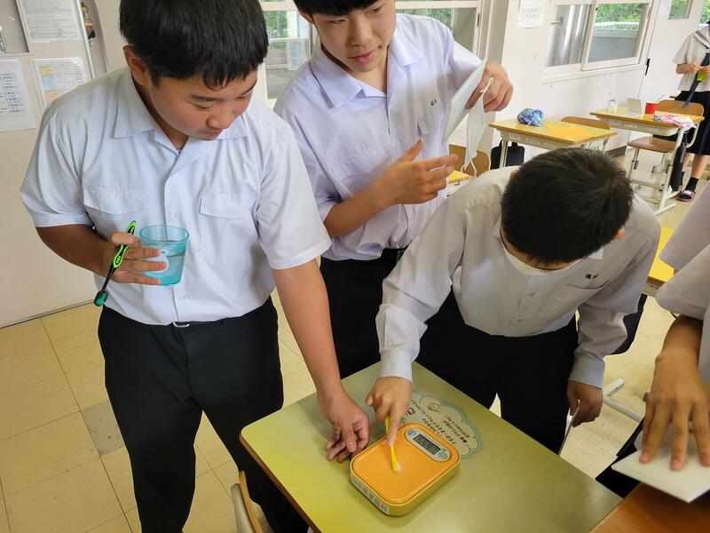 視覚に訴える様々な資料を黒板に掲示し、歯や歯ブラシの模型を使って、丁寧に指導してくださいました。歯ブラシをあてる強さを見るはかりを用いて、実際にどのくらいの強さで歯を磨いたらよいのかも知ることができました。
