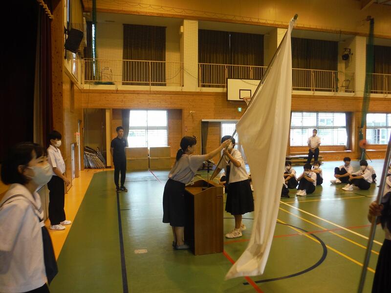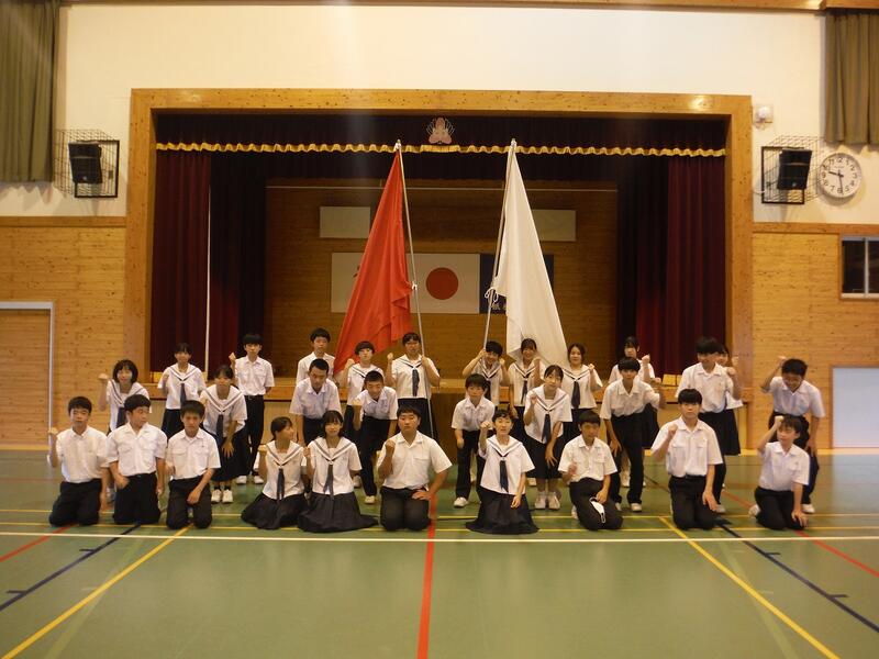 1時間目に集会を行い、表彰や先生方からのお話の後、運動会準備の時間として、まだ渡せていなかった紅白の団旗を各団長に手渡しました。